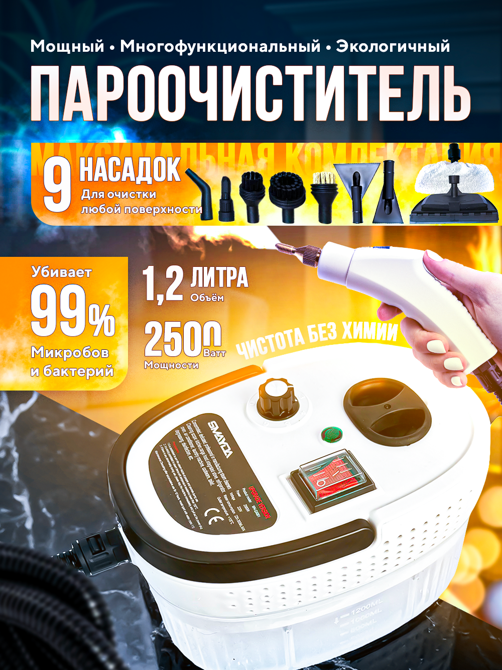 Для пароочистителей важно сразу показать универсальность, экологичность и мощность. Поэтому на обложке мы вынесли: