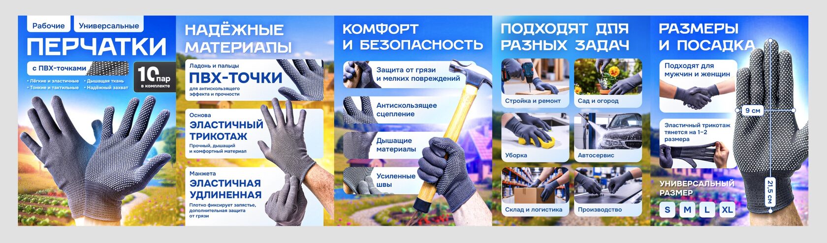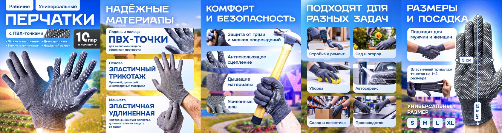 Как сделать инфографику для перчаток у себя. Начните с «паспорта линейки»: покрытие (нитрил/латекс/PU), основа (хлопковый трикотаж), манжета (короткая/удлинённая), сценарии (стройка, сад, склад, производство, авто, уборка). Снимайте все модели в одном свете, с маркерами масштаба — молоток, короб, металлическая кромка. Под инфографику держите один фон и одну пару шрифтов; заголовки на 2–4 слова, подписи до 10–14, без «простынь».