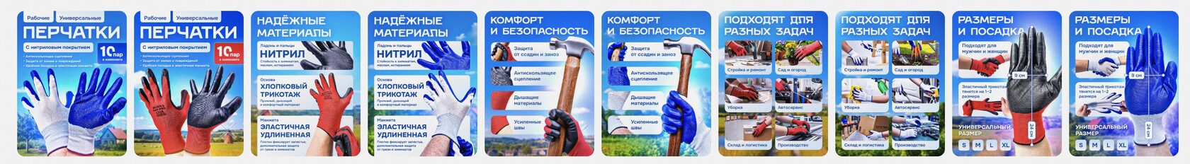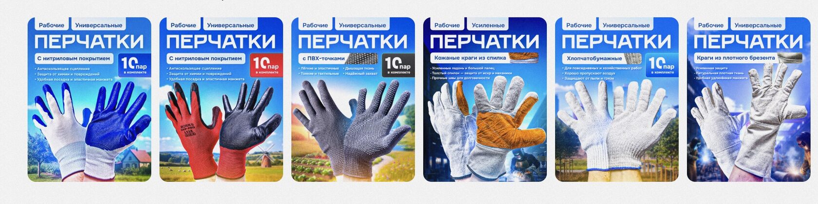 Перчатки — товар сравнения: пользователь листает десятки карточек. Разный свет, случайные шрифты и пёстрые фоны ломают узнаваемость, мозг ставит паузу. Когда у всей линейки один визуальный язык и повторяемая структура, решение принимается быстрее, а вопросов «это точно подойдёт для склада/сада?» становится меньше.