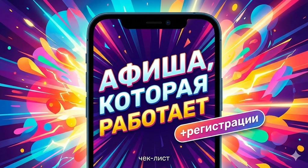 Почти все увидят ваш анонс сначала на смартфоне: в сторис, в посте, в чате, в пересланном скрине. Поэтому главный критерий не “как красиво”, а как быстро считывается. Хорошая афиша читается по диагонали: крупное → важное → действие.